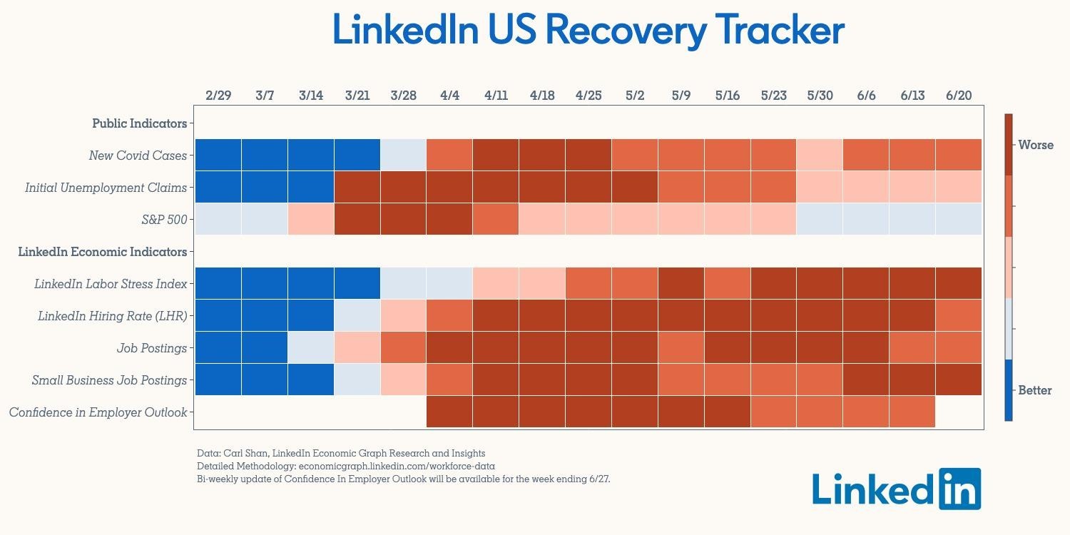 The tracker includes first and foremost, a measure for the number of new COVID-19 cases reported, as well as unemployment insurance claims, the S&P 500, and our own layer of real-time data: the LinkedIn Hiring Rate, the Workforce Confidence Index, and job postings on LinkedIn.
